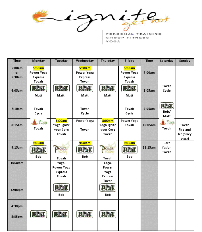 Call me (Mark) at 520.400.9573 and/or fill out the form below now so we can schedule you a consultation and find out how we can help you reach your goals through group training. Below is Matt (the owner of Ignite) coaching one of the classes and then there is a sample schedule of what we are offering.*